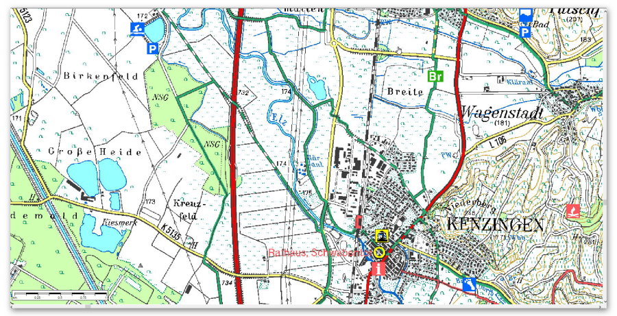 Der Nachtallmendsee liegt an der westlichen Umgehungsstrasse am Rande der Gewerbegebiete von Kenzingen. Parkplätze sind auf der Südseite des Sees vorhanden.