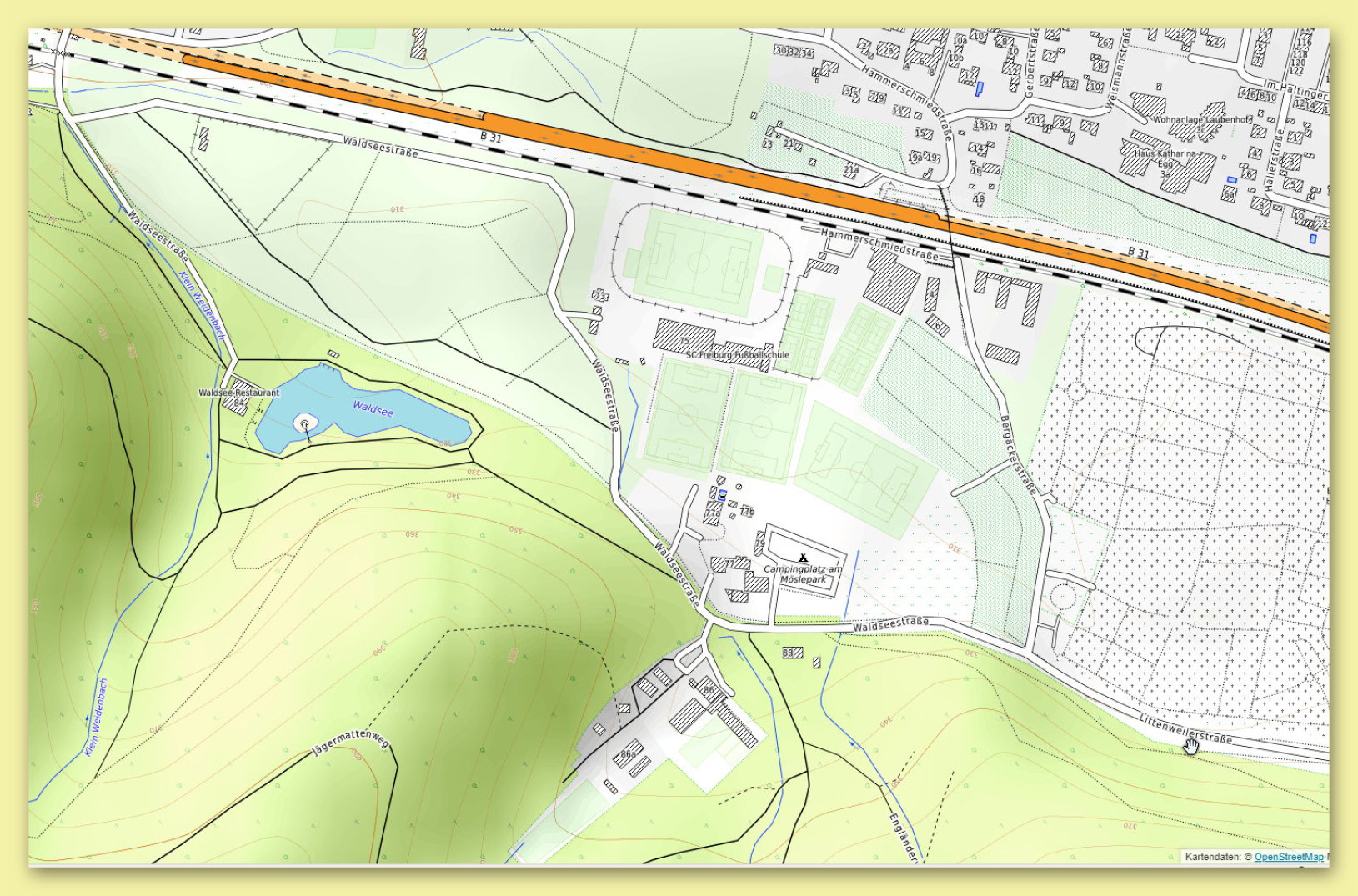 Der Waldsee ist an der Waldseestraße beim Möslepark beim Stadtteil Waldsee im Osten von Freiburg.