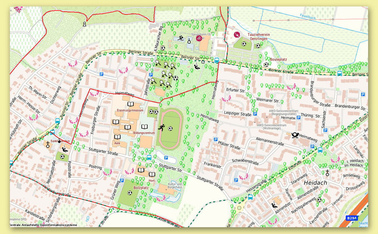 Der Denzlinger Stadtpark ist zwischen der Berliner Straße und der Stuttgarter Straße. Am Stadtpark ist das Schwimmbad, die Schulsportanlagen, die Tennisplätze und das Kultur-und Bürgerhaus.